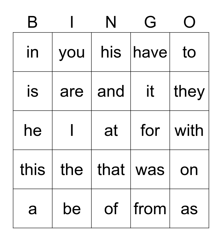 This bingo card has 25 words: the, of, and, a, to, in, is, you, for, that, it, he, was, on, are, as, with, his, they, I, at, be, this, have and from.