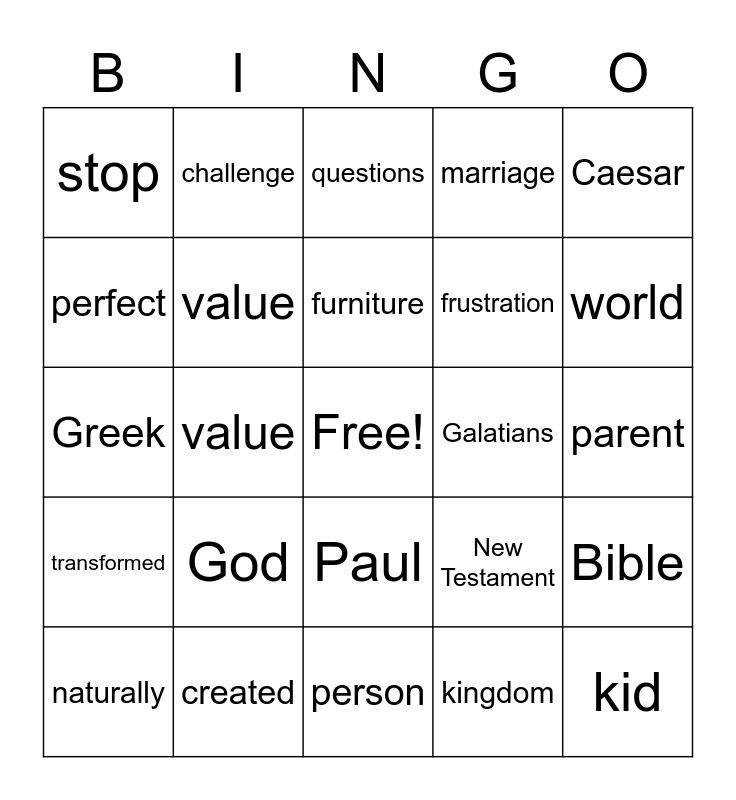 This bingo card has a free space and 29 words: naturally, actually, value, story, stop, questions, value, God, Galatians, created, parent, kid, person, kingdom, world, Romans, Paul, transformed, Caesar, Greek, New Testament, money, frustration, perfect, marriage, challenge, Bible, furniture and old.