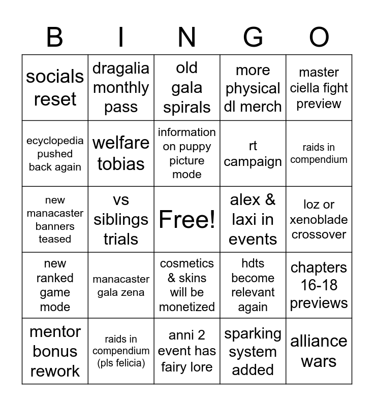 This bingo card has a free space and 24 words: manacaster gala zena, raids in compendium (pls felicia), information on puppy picture mode, mentor bonus rework, master ciella fight preview, socials reset, ecyclopedia pushed back again, dragalia monthly pass, alex & laxi in events, cosmetics & skins will be monetized, rt campaign, new manacaster banners teased, hdts become relevant again, chapters 16-18 previews, welfare tobias, sparking system added, loz or xenoblade crossover, old gala spirals, raids in compendium, vs siblings trials, alliance wars, new ranked game mode, more physical dl merch and anni 2 event has fairy lore.