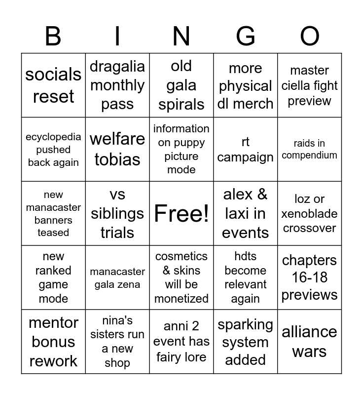 This bingo card has a free space and 24 words: manacaster gala zena, nina's sisters run a new shop, information on puppy picture mode, mentor bonus rework, master ciella fight preview, socials reset, ecyclopedia pushed back again, dragalia monthly pass, alex & laxi in events, cosmetics & skins will be monetized, rt campaign, new manacaster banners teased, hdts become relevant again, chapters 16-18 previews, welfare tobias, sparking system added, loz or xenoblade crossover, old gala spirals, raids in compendium, vs siblings trials, alliance wars, new ranked game mode, more physical dl merch and anni 2 event has fairy lore.