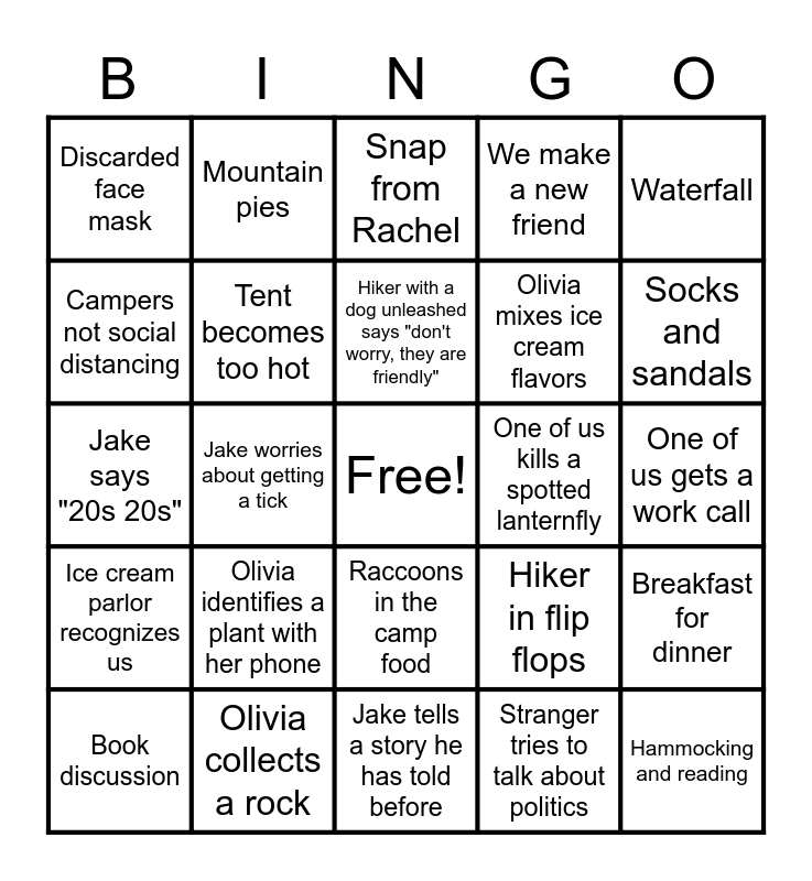 This bingo card has a free space and 25 words: Olivia identifies a plant with her phone, Jake tells a story he has told before, Hiker with a dog unleashed says "don't worry, they are friendly", Book discussion, Waterfall, Discarded face mask, Campers not social distancing, Mountain pies, One of us kills a spotted lanternfly, Raccoons in the camp food, Olivia mixes ice cream flavors, Jake says "20s 20s", Hiker in flip flops, Breakfast for dinner, Tent becomes too hot, Tent becomes too cold, One of us gets a work call, Snap from Rachel, Socks and sandals, Jake worries about getting a tick, Hammocking and reading, Olivia collects a rock, Ice cream parlor recognizes us, We make a new friend and Stranger tries to talk about politics.