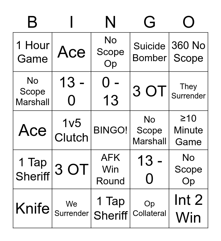 This bingo card has a free space and 27 words: 13 - 0, 0 - 13, 3 OT, 1 Tap Sheriff, No Scope Marshall, No Scope Op, Ace, 1 Tap Sheriff, No Scope Marshall, No Scope Op, Ace, Suicide Bomber, Knife, We Surrender, They Surrender, Classic Only on Buy Round, 13 - 0, 0 - 13, 3 OT, 1 Hour Game, ≥10 Minute Game, Op Collateral, 1v5 Clutch, Int 2 Win, AFK Win Round, 360 No Scope and Inhuman Reaction (180 1Tap).