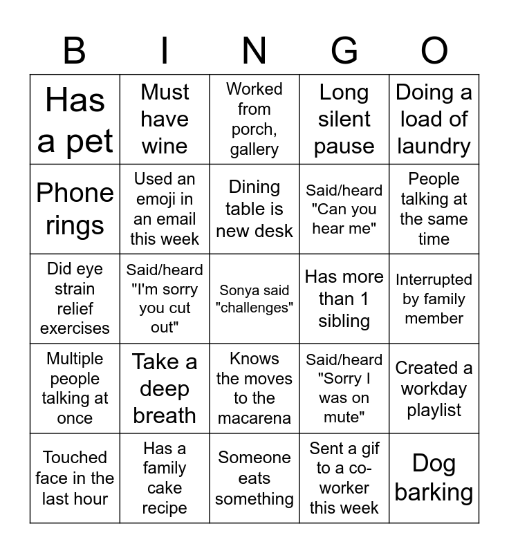 This bingo card has a free space and 24 words: Take a deep breath, Has a family cake recipe, Dining table is new desk, Touched face in the last hour, Doing a load of laundry, Has a pet, Phone rings, Must have wine, Has more than 1 sibling, Knows the moves to the macarena, Said/heard "Can you hear me", Did eye strain relief exercises, Said/heard "Sorry I was on mute", Created a workday playlist, Used an emoji in an email this week, Sent a gif to a co-worker this week, Interrupted by family member, Worked from porch, gallery, People talking at the same time, Said/heard "I'm sorry you cut out", Dog barking, Multiple people talking at once, Long silent pause and Someone eats something.