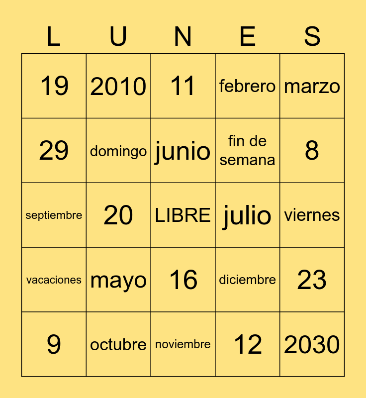 This bingo card has a free space and 69 words: lunes, martes, miércoles, jueves, viernes, sábado, domingo, semana, fin de semana, semana escolar, vacaciones, enero, febrero, marzo, abril, mayo, junio, julio, agosto, septiembre, octubre, noviembre, diciembre, mes, año, 2020, 2021, 2022, 2030, 2019, 2010, 1, 2, 3, 4, 5, 6, 7, 8, 9, 10, 11, 12, 13, 14, 15, 16, 17, 18, 19, 20, 21, 22, 23, 24, 25, 26, 27, 28, 29, 30, 31, HOY, ayer, mañana, anteayer, pasado mañana, el mes próximo and el mes pasado.
