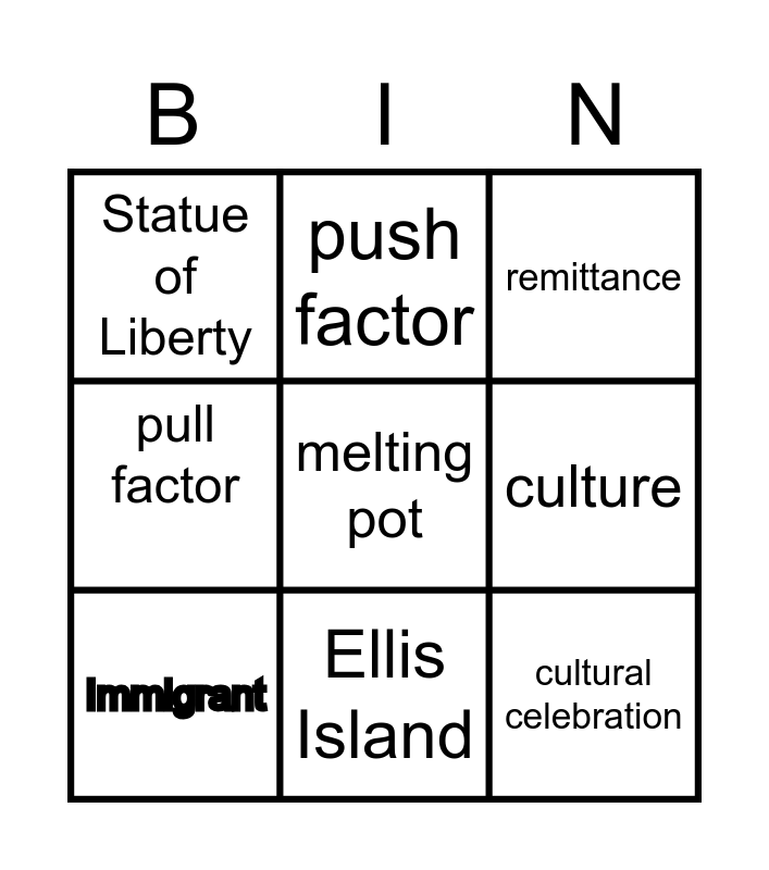 This bingo card has 9 words: Immigrant, remittance, push factor, pull factor, Statue of Liberty, culture, melting pot, cultural celebration and Ellis Island.