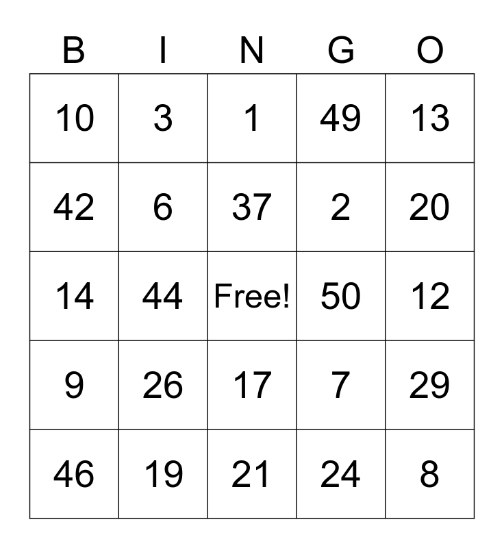 This bingo card has a free space and 24 words: 26, 19, 37, 46, 13, 10, 42, 3, 50, 17, 2, 14, 7, 29, 6, 24, 12, 1, 20, 44, 8, 9, 49 and 21.