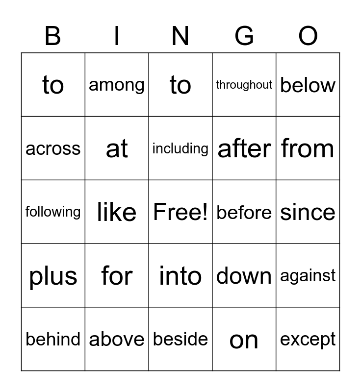 This bingo card has a free space and 29 words: behind, at, like, with, to, to, at, for, before, above, since, except, beside, on, from, out, into, plus, below, following, down, under, after, across, throughout, among, against, including and concerning.
