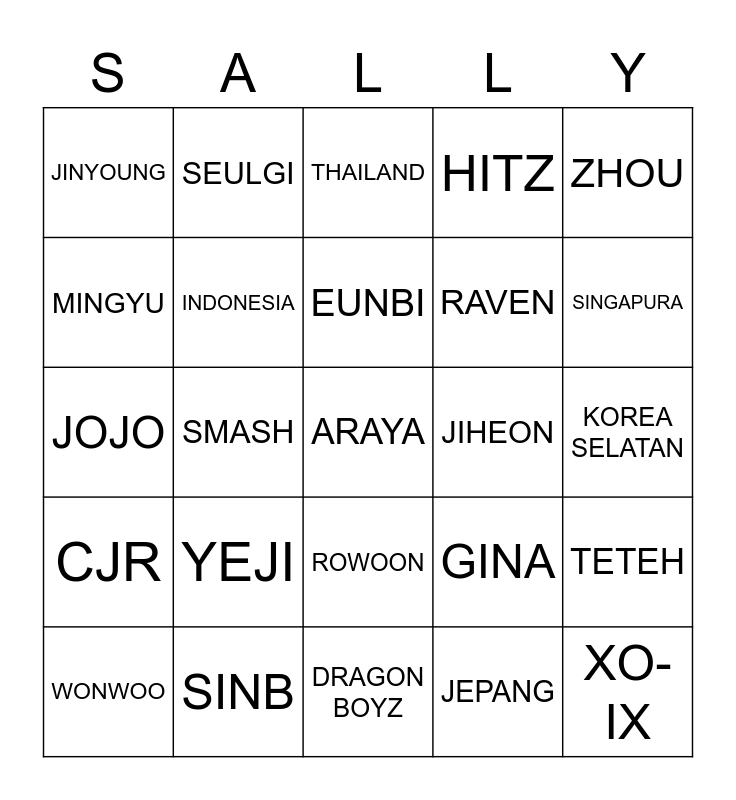 This bingo card has a free space and 24 words: YEJI, SINB, EUNBI, WONWOO, ZHOU, JINYOUNG, MINGYU, SEULGI, JIHEON, ROWOON, RAVEN, JOJO, GINA, TETEH, INDONESIA, JEPANG, KOREA SELATAN, THAILAND, SINGAPURA, SMASH, XO-IX, CJR, HITZ and DRAGON BOYZ.