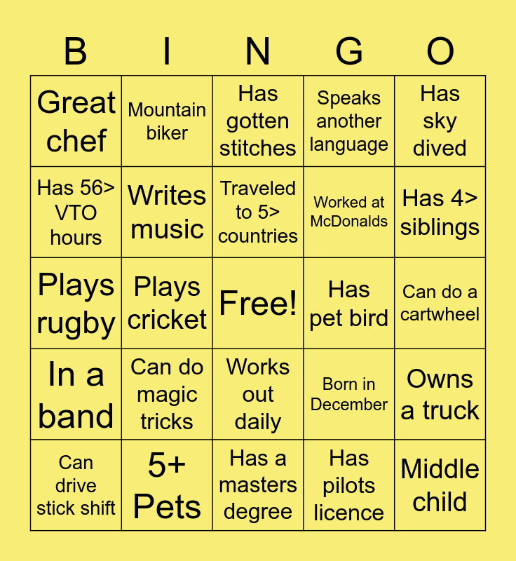 This bingo card has a free space and 59 words: 4+ children, 5+ Pets, Plays an instrument, In a band, Has pilots licence, Great dancer, Writes music, Writes poetry, Worked at McDonalds, Learned new skill during quarantine, Speaks another language, Speaks 3> languages, Has 56> VTO hours, Trailhead Ranger, Works on cars, Great chef, Middle child, Has sky dived, Youngest child, Traveled to 5> countries, Has pet bird, Has gotten stitches, Can drive stick shift, Owns a truck, Never lived outside TX, Grew up on a farm, Is a twin, Takes cruise ship vacations, Has 4> siblings, Rock climber, Owns a boat, Can water ski, Plays tennis, Road cyclist, Mountain biker, Kayaks, Snow skier, Plays cricket, Volleyball player, Plays rugby, Plays golf, Can do magic tricks, Can do a cartwheel, Can do the splits, Has been a waiter/waitress, Doesn't like chocolate, Doesn't like pizza, Has baby under 1 year, Works out daily, Has a masters degree, Has a PhD, Ran a marathon, Has done a triathlon, Loves to paint, Wore braces, Born in December, Dislikes country music, Loves country music and Loves Jazz music.