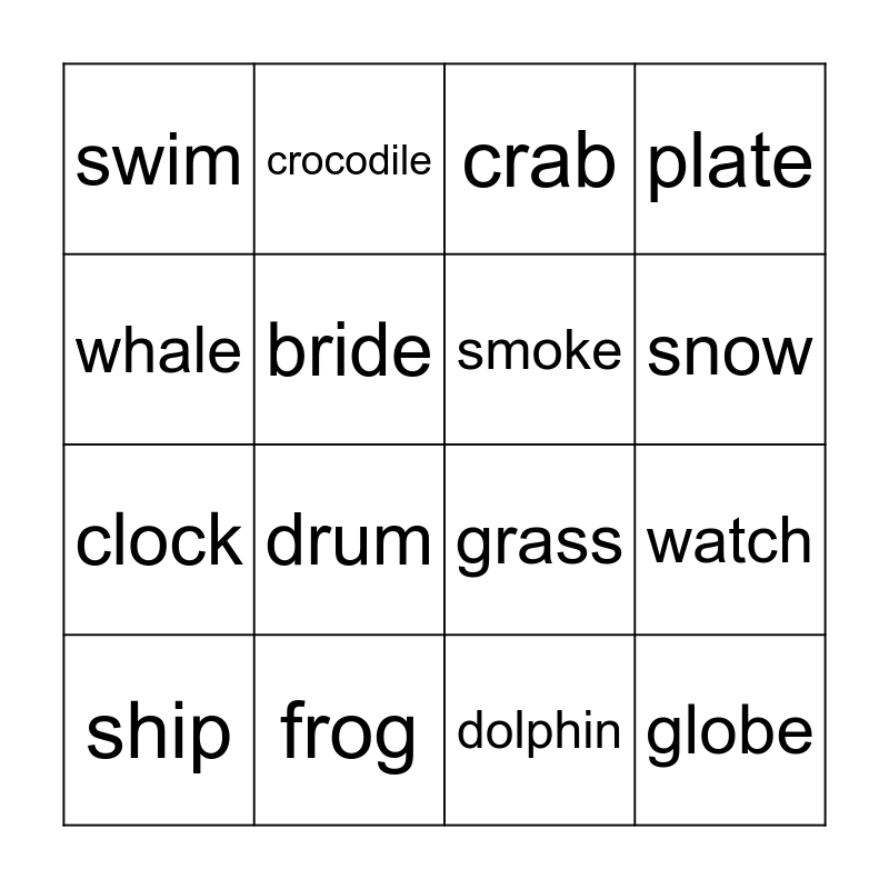 This bingo card has 28 words: black, blanket, clock, club, bride, crab, crocodile, globe, frog, Friday, grass, plate, play, slide, drum, tree, smile, smoke, snow, spot, swim, stamp, ship, watch, dolphin, white, whale and catch.