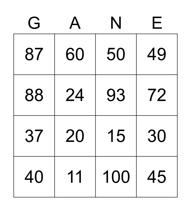 This bingo card has 24 words: 14, 65, 72, 12, 88, 87, 24, 60, 11, 31, 37, 15, 76, 13, 93, 90, 100, 50, 20, 30, 40, 45, 49 and 56.