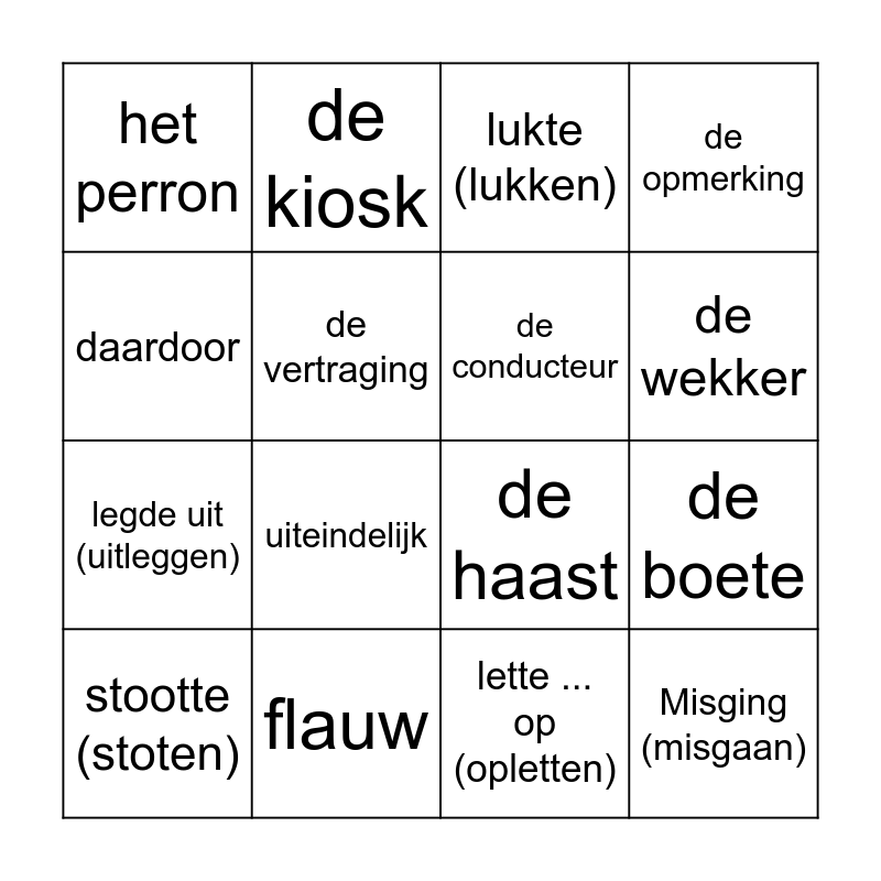 This bingo card has 23 words: Misging (misgaan), vergeten, de wekker, werd wakker (wakker worden), daardoor, het perron, de vertraging, de kiosk, stootte (stoten), boos, uiteindelijk, legde uit (uitleggen), uitpraten, schiet op! (opschieten), flauw, de grap, lukte (lukken), de haast, de conducteur, de boete, de opmerking, lette ... op (opletten) and verbrand (verbranden).