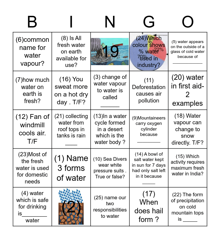 This bingo card has 3 images, a free space and 24 words: (1) Name 3 forms of water, (2), (3) change of water vapour to water is called ______, (4) water which is safe for drinking is________ water, (5) water appears on the outside of a glass of cold water because of _____________, (6)common name for water vapour?, (7)how much water on earth is fresh?, (8) Is All fresh water on earth available for use?, (9)Mountaineers carry oxygen cylinder because _________, (10) Sea Divers wear white pressure suits . True or false?, (11) Deforestation causes air pollution, (12) Fan of windmill cools air. T/F, (14) A bowl of salt water kept in sun for 7 days had only salt left in it because _____, (15) Which activity requires maximum fresh water in India?, (16) You sweat more on a hot dry day . T/F?, (17) When does hail form ?, (18) Water vapour can change to snow directly. T/F?, 19, (20) water in first aid- 2 examples, (21) collecting water from roof tops in tanks is rain ____, (22) The form of precipitation on cold mountain tops is _____, (23)Most of the fresh water is used for domestic needs, (24)Which colour shows % water used in industry? and (25) name our two responsibilities to water.