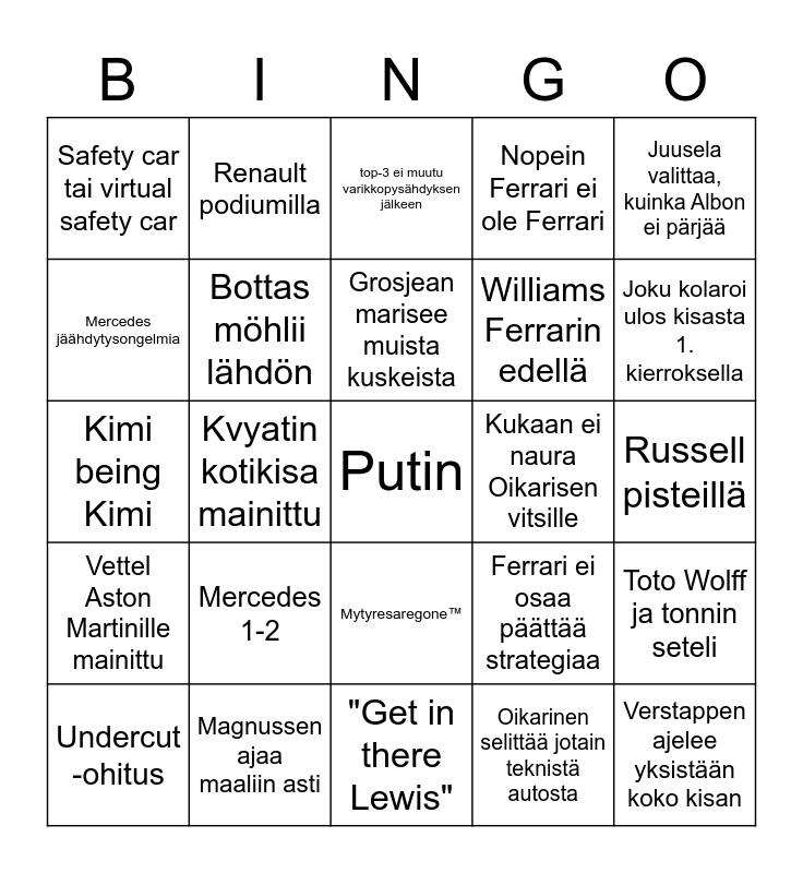This bingo card has 25 words: Mercedes 1-2, "Get in there Lewis", Grosjean marisee muista kuskeista, Undercut -ohitus, Juusela valittaa, kuinka Albon ei pärjää, Safety car tai virtual safety car, Mercedes jäähdytysongelmia, Renault podiumilla, Kukaan ei naura Oikarisen vitsille, Mytyresaregone™, Williams Ferrarin edellä, Kimi being Kimi, Ferrari ei osaa päättää strategiaa, Toto Wolff ja tonnin seteli, Bottas möhlii lähdön, Verstappen ajelee yksistään koko kisan, Russell pisteillä, top-3 ei muutu varikkopysähdyksen jälkeen, Joku kolaroi ulos kisasta 1. kierroksella, Kvyatin kotikisa mainittu, Putin, Magnussen ajaa maaliin asti, Vettel Aston Martinille mainittu, Nopein Ferrari ei ole Ferrari and Oikarinen selittää jotain teknistä autosta.