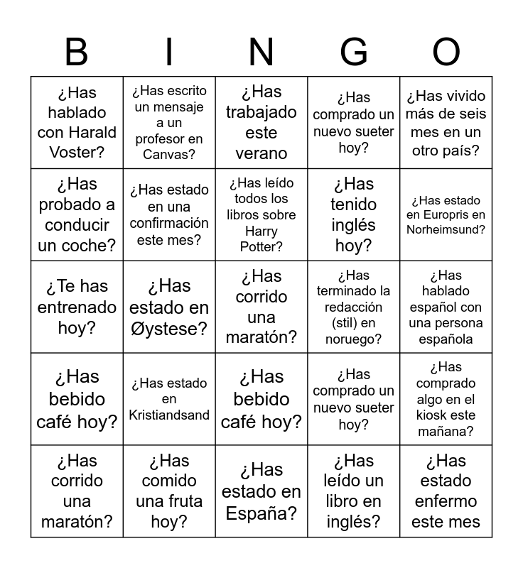 This bingo card has 25 words: ¿Has estado en Kristiandsand, ¿Has estado en España?, ¿Has leído todos los libros sobre Harry Potter?, ¿Has corrido una maratón?, ¿Has vivido más de seis mes en un otro país?, ¿Has hablado con Harald Voster?, ¿Has probado a conducir un coche?, ¿Has escrito un mensaje a un profesor en Canvas?, ¿Has terminado la redacción (stil) en noruego?, ¿Has bebido café hoy?, ¿Has tenido inglés hoy?, ¿Te has entrenado hoy?, ¿Has comprado un nuevo sueter hoy?, ¿Has comprado algo en el kiosk este mañana?, ¿Has estado en una confirmación este mes?, ¿Has estado enfermo este mes, ¿Has hablado español con una persona española, ¿Has trabajado este verano, ¿Has estado en Europris en Norheimsund?, ¿Has estado en Øystese?, ¿Has corrido una maratón?, ¿Has comido una fruta hoy?, ¿Has bebido café hoy?, ¿Has comprado un nuevo sueter hoy? and ¿Has leído un libro en inglés?.