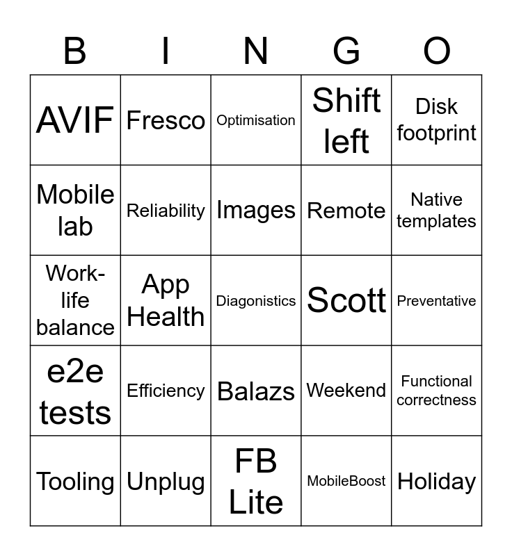 This bingo card has 37 words: Bloks, QPL, Performance, Reliability, Functional correctness, Efficiency, Images, Storage, Disk footprint, Product foundation, App Health, Shift left, Diagonistics, Preventative, Mobile lab, e2e tests, Stack trace, Optimisation, Balazs, Scott, AVIF, Native templates, Tooling, FB Lite, Workplace, MobileBoost, Fresco, Mosaic, Loom, Portal, Focus, Unplug, Work-life balance, Holiday, Weekend, Remote and COVID.