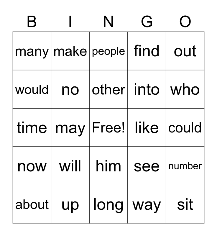 This bingo card has a free space and 24 words: will, up, other, about, out, many, would, make, like, him, into, time, see, number, no, way, could, people, who, may, sit, now, find and long.