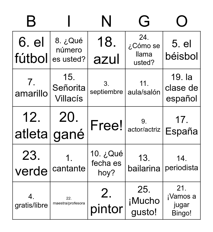 This bingo card has a free space and 25 words: 1. cantante, 2. pintor, 3. septiembre, 4. gratis/libre, 5. el béisbol, 6. el fútbol, 7. amarillo, 8. ¿Qué número es usted?, 9. actor/actriz, 10. ¿Qué fecha es hoy?, 11. aula/salón, 12. atleta, 13. bailarina, 14. periodista, 15. Señorita Villacís, 16. México, 17. España, 18. azul, 19. la clase de español, 20. gané, 21. ¡Vamos a jugar Bingo!, 22. maestra/profesora, 23. verde, 24. ¿Cómo se llama usted? and 25. ¡Mucho gusto!.