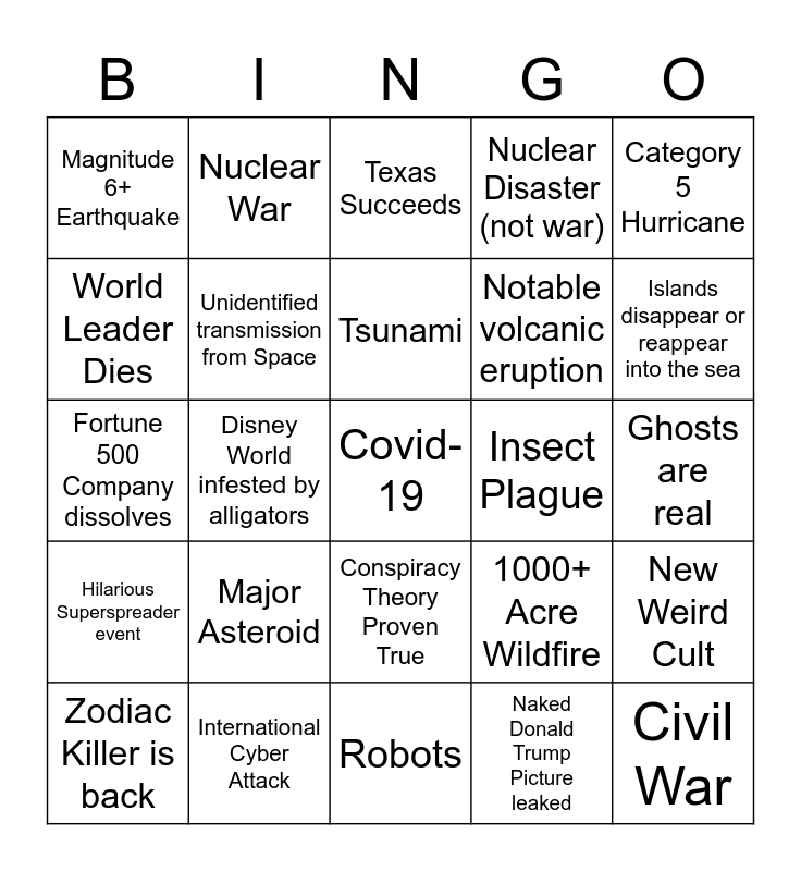 This bingo card has a free space and 24 words: Major Asteroid, International Cyber Attack, Tsunami, Zodiac Killer is back, Category 5 Hurricane, Magnitude 6+ Earthquake, World Leader Dies, Nuclear War, Insect Plague, Conspiracy Theory Proven True, Notable volcanic eruption, Fortune 500 Company dissolves, 1000+ Acre Wildfire, New Weird Cult, Unidentified transmission from Space, Naked Donald Trump Picture leaked, Ghosts are real, Texas Succeeds, Islands disappear or reappear into the sea, Disney World infested by alligators, Civil War, Hilarious Superspreader event, Nuclear Disaster (not war) and Robots.