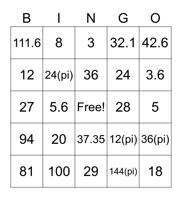 This bingo card has a free space and 24 words: 20, 100, 36, 81, 42.6, 111.6, 12, 8, 28, 37.35, 24, 27, 12(pi), 36(pi), 24(pi), 144(pi), 5, 3, 3.6, 5.6, 18, 94, 32.1 and 29.