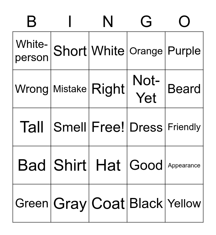 This bingo card has a free space and 44 words: RED, Yellow, Blue, Green, Brown, Black, White, Pink, Purple, Gray, Orange, Dress, Hat, Shirt, Skirt, Coat, Hair, Tall, Thin, Beard, Short, Pretty, Ugly, White-person, Smart, Friendly, Arrogant, Snob, Good, Bad, Sweet-natured, Appearance, Feel, Taste, Smell, Sound, Same, See, Right, Wrong, Not-Yet, That-One, Mistake and Mouth.