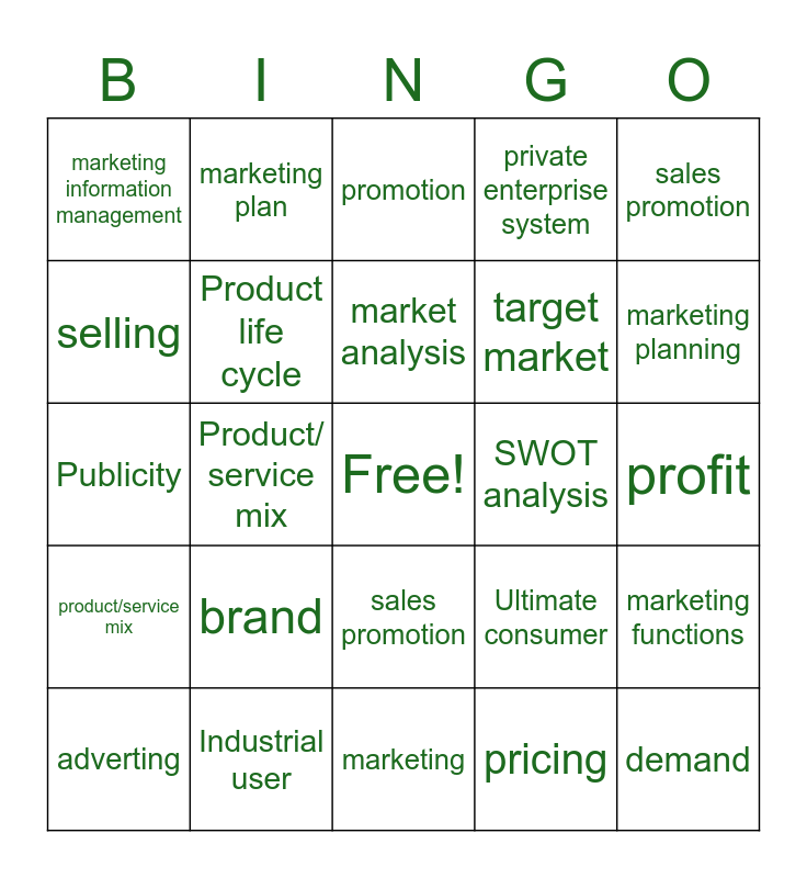 This bingo card has a free space and 29 words: adverting, budget, Product/ service mix, channel management, marketing information management, promotion, Product life cycle, brand, SWOT analysis, Industrial user, profit, demand, marketing, pricing, marketing planning, standard of living, sales promotion, product/service mix, sales promotion, Publicity, Ultimate consumer, competition, target market, selling, private enterprise system, marketing plan, marketing functions, market analysis and channels of distribution.