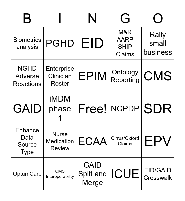 This bingo card has a free space and 46 words: Corrected and Cancelled Claims, EID/GAID Crosswalk, Reprocess Transaction History, GAID Split and Merge, Nurse Medication Review, Medication Note by Nurse, PGHD, NGHD, NGHD Adverse Reactions, NGHD RX Add, Enterprise Clinician Roster, M&R AARP SHIP Claims, EPV, Cirrus/Oxford Claims, Historical Oxford Claims, ADT, EPIM, NCPDP, Raw Immunization Data, Rally small business, iMDM phase 1, ICUE, Biometrics analysis, Ontology Reporting, Histogram analysis for API team, CMS, OptumCare, iMDM phase 2, ECAA, Enhance Data Source Type, RTA, Helium/Level 2, 404 Analysis, Member-matched Data, IDR, CMS Interoperability, SDR, API, iMDM Golden Record, AARP, SHIP, EID, GAID, Medicare Supplement, COMPAS and Monarch Healthcare.