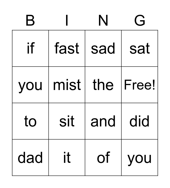 This bingo card has 17 words: of, dad, sad, if, sit, sat, did, the, Free!, mist, it, and, you, fast, to, on and you.