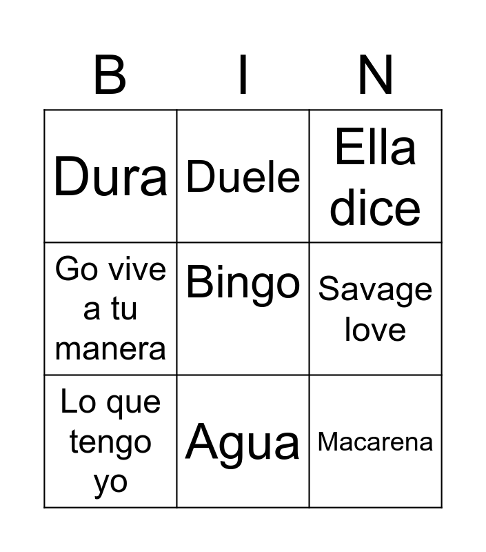 This bingo card has a free space and 11 words: Relacion, Agua, Macarena, Lo que tengo yo, Duele, Ella dice, Savage love, Hola que tal, Go vive a tu manera, Dura and Yummy.