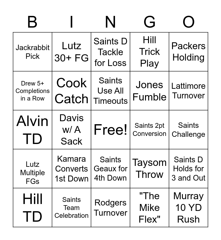 This bingo card has a free space and 34 words: Drew TD, "The Mike Flex", Cam Sack, Saints Win Coin Toss, Lutz Multiple FGs, Cook Catch, Packers Holding, Hill TD, Lutz 30+ FG, Packers Pass Interference, Saints Use All Timeouts, Saints D Tackle for Loss, Payton Wears Mask, Drew 100+ YDs, Saints 2pt Conversion, Lattimore Turnover, Saints Team Celebration, Alvin TD, Kamara Converts 1st Down, Taysom Throw, Saints Geaux for 4th Down, Morestead Pins Pack Inside 20, Jackrabbit Pick, Saints Challenge, Rodgers Turnover, Murray 10 YD Rush, Hill Trick Play, Cook 3rd Down Catch, Jones Fumble, Drew 5+ Completions in a Row, Saints Have the Ball @ 2Min Warning, Davis w/ A Sack, Saints D Holds for 3 and Out and Murray TD.