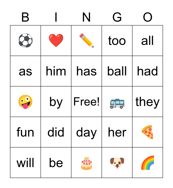 This bingo card has a free space and 24 words: did, be, has, will, all, ⚽️, as, ❤️, 🚌, day, ball, 🤪, her, 🍕, him, 🐶, they, ✏️, had, by, 🌈, fun, too and 🎂.
