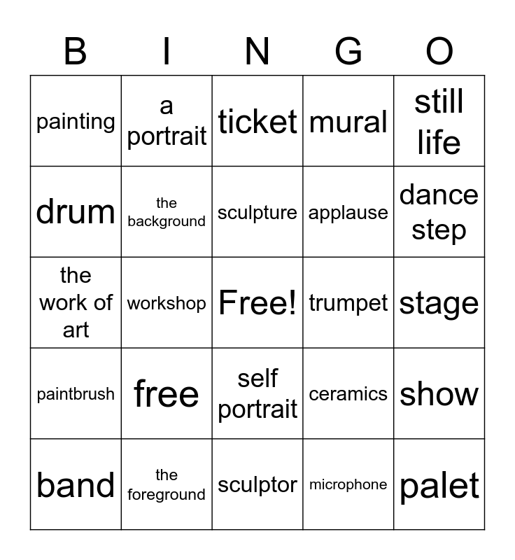 This bingo card has a free space and 24 words: free, the foreground, sculpture, band, still life, painting, drum, a portrait, trumpet, self portrait, applause, the work of art, ceramics, show, the background, microphone, stage, ticket, dance step, workshop, palet, paintbrush, mural and sculptor.
