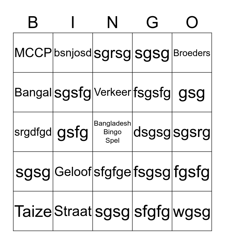 This bingo card has a free space and 24 words: Geloof, Straat, Verkeer, Taize, Broeders, MCCP, Bangal, bsnjosd, dsgsg, sfgfge, fsgsfg, srgdfgd, fsgsg, fgsfg, sgsfg, sfgfg, sgsrg, sgrsg, gsg, gsfg, wgsg, sgsg, sgsg and sgsg.