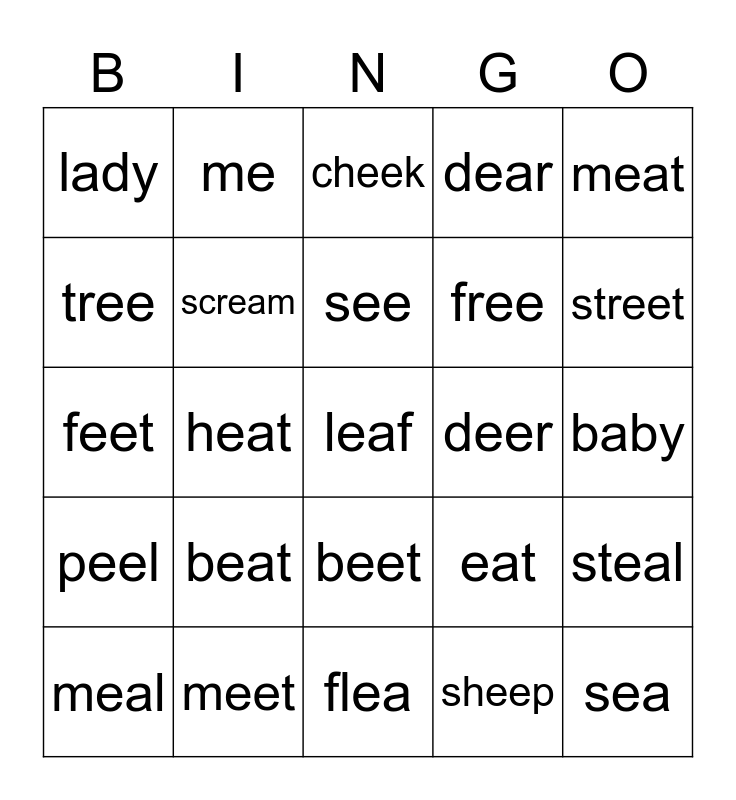 This bingo card has 44 words: read, leaf, team, meal, dreams, sheep, cheek, be, meat, meet, dear, deer, beet, beat, flee, flea, bean, feet, seat, street, me, beads, money, lady, donkey, baby, jeep, Pete, eat, peel, seal, steal, real, heal, heat, feel, knee, sea, see, tree, free, bee, scream and stream.