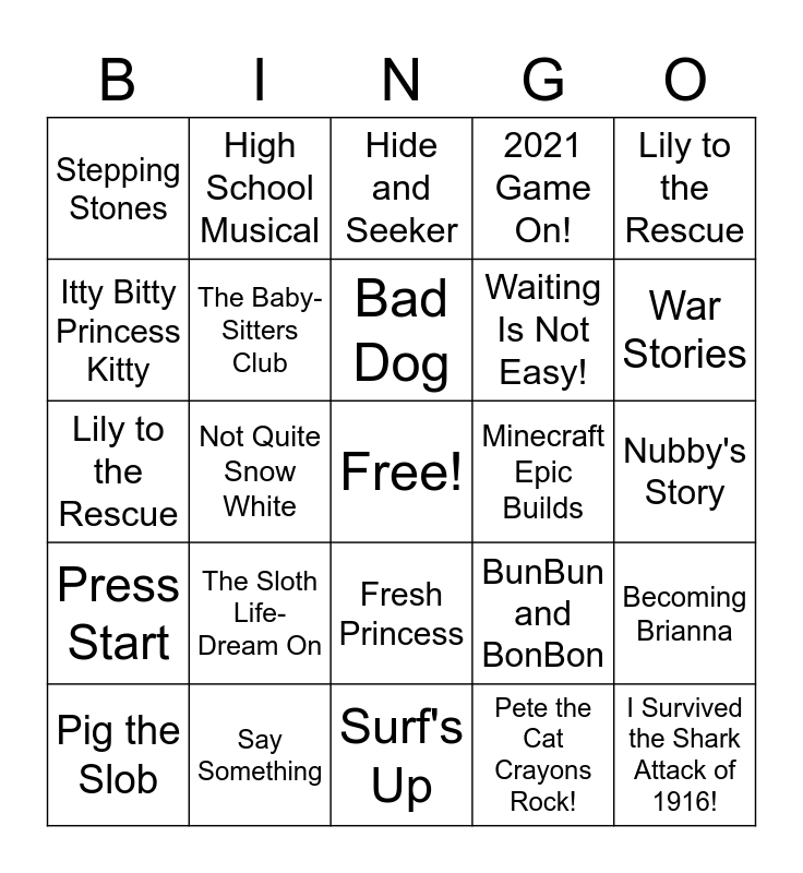 This bingo card has a free space and 39 words: One and Only Ivan, Dog Man Grime and Punishment, Blended, The Baby-Sitters Club, Pig the Slob, Fresh Princess, Bad Dog, Fly Guy and Fly Girl, Lily to the Rescue, Press Start, Not Quite Snow White, 2021 Game On!, I Survived the Shark Attack of 1916!, Nubby's Story, Minecraft Epic Builds, The Sloth Life-Dream On, Upside Down Magic- Hide and Seek, Stepping Stones, Elbow Grease, BunBun and BonBon, Itty Bitty Princess Kitty, Surf's Up, Waiting Is Not Easy!, War Stories, Out of Hiding, Who Will It Be?, Go Away, Unicorn, Handbook to the Galar Region, Bite Into Sharks!, High School Musical, I Survived the California Wildfires, Follow Me, Hide and Seeker, Say Something, Pete the Cat Crayons Rock!, I Am One, Becoming Brianna, Lily to the Rescue and Owl Diaries.