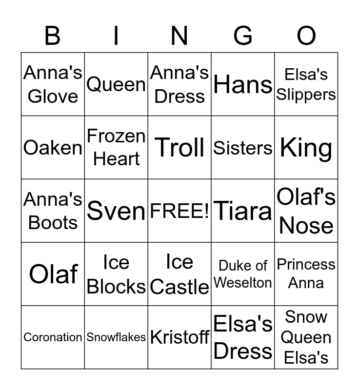 This bingo card has a free space and 24 words: Ice Blocks, Snowflakes, Troll, Coronation, Elsa's Slippers, Anna's Glove, Oaken, Queen, Tiara, Ice Castle, Sisters, Anna's Boots, Duke of Weselton, Princess Anna, Frozen Heart, Elsa's Dress, Olaf's Nose, Anna's Dress, King, Sven, Snow Queen Elsa's, Olaf, Hans and Kristoff.
