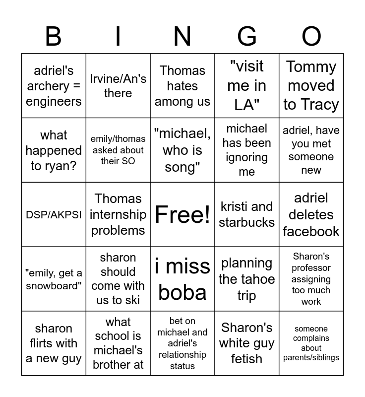 This bingo card has a free space and 24 words: sharon should come with us to ski, what school is michael's brother at, "michael, who is song", sharon flirts with a new guy, Tommy moved to Tracy, adriel's archery = engineers, what happened to ryan?, Irvine/An's there, kristi and starbucks, i miss boba, michael has been ignoring me, DSP/AKPSI, planning the tahoe trip, Sharon's professor assigning too much work, emily/thomas asked about their SO, Sharon's white guy fetish, adriel deletes facebook, Thomas hates among us, adriel, have you met someone new, Thomas internship problems, someone complains about parents/siblings, "emily, get a snowboard", "visit me in LA" and bet on michael and adriel's relationship status.