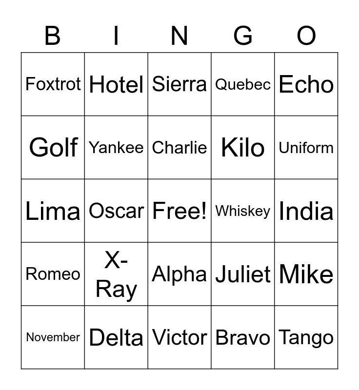 This bingo card has a free space and 26 words: Alpha, Bravo, Charlie, Delta, Echo, Foxtrot, Golf, Hotel, India, Juliet, Kilo, Lima, Mike, November, Oscar, Papa, Quebec, Romeo, Sierra, Tango, Uniform, Victor, Whiskey, X-Ray, Yankee and Zulu.