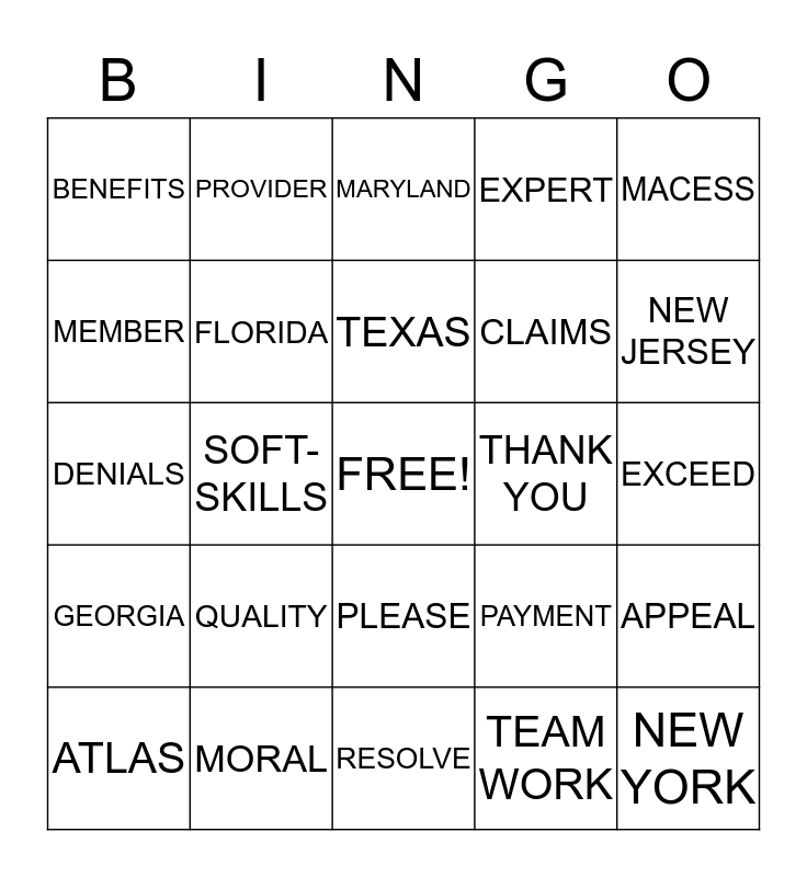 This bingo card has a free space and 24 words: QUALITY, MORAL, TEXAS, ATLAS, MACESS, BENEFITS, MEMBER, PROVIDER, THANK YOU, PLEASE, CLAIMS, DENIALS, PAYMENT, APPEAL, FLORIDA, TEAM WORK, EXCEED, MARYLAND, NEW JERSEY, SOFT-SKILLS, NEW YORK, GEORGIA, EXPERT and RESOLVE.