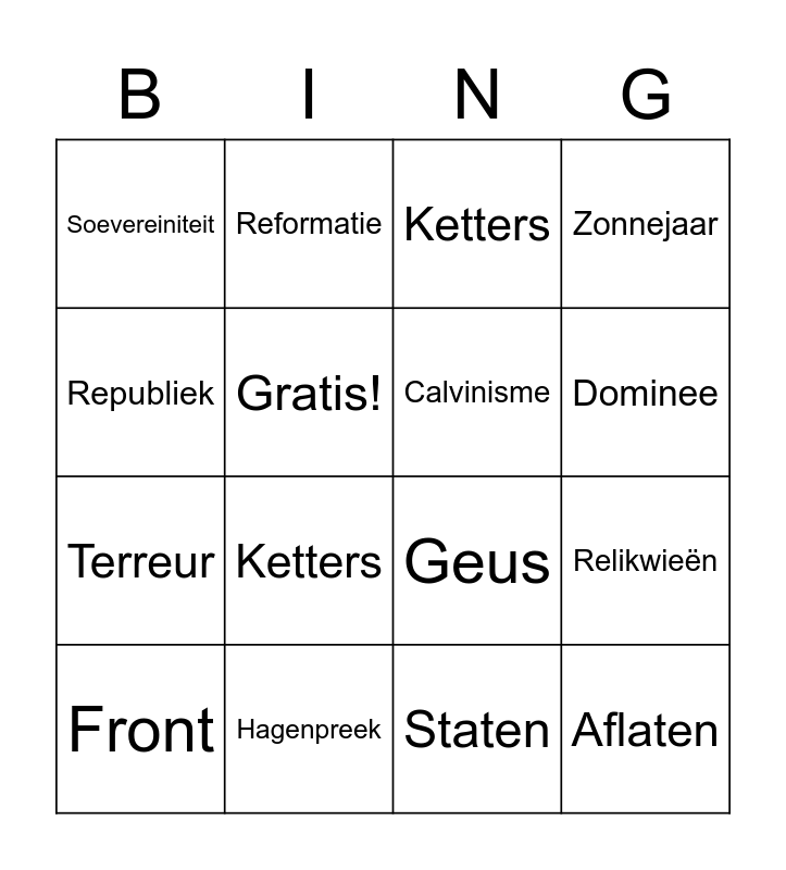 This bingo card has 16 words: Hagenpreek, Relikwieën, Ketters, Soevereiniteit, Terreur, Reformatie, Geus, Staten, Republiek, Gratis!, Front, Zonnejaar, Ketters, Dominee, Calvinisme and Aflaten.