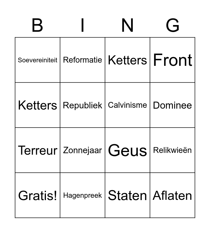 This bingo card has 16 words: Hagenpreek, Relikwieën, Ketters, Soevereiniteit, Terreur, Reformatie, Geus, Staten, Ketters, Republiek, Gratis!, Front, Zonnejaar, Dominee, Calvinisme and Aflaten.