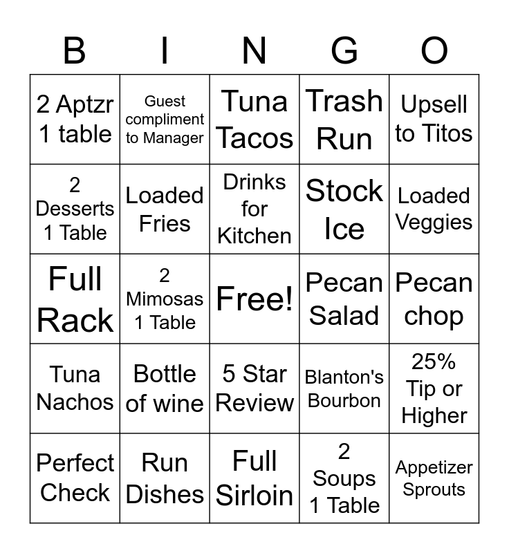 This bingo card has a free space and 29 words: Perfect Check, 1st Time Guest Verified -Know their Name, 2 Mimosas 1 Table, Wings Traditional, 2 Aptzr 1 table, Tuna Tacos, Loaded Fries, Bottle of wine, Pecan Salad, Run Dishes, Pecan chop, Appetizer Sprouts, Full Sirloin, 2 Soups 1 Table, Loaded Veggies, 4 Beers 1 Table, 5 Star Review, Tuna Nachos, Upsell to Titos, Full Rack, Blanton's Bourbon, Steak & Wedge, Stock Ice, 2 Desserts 1 Table, Trash Run, Guest compliment to Manager, 25% Tip or Higher, Drinks for Kitchen and Stone Salmon.
