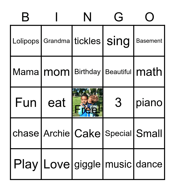 This bingo card has a free space and 24 words: Archie, Love, Birthday, Play, Basement, Lolipops, Mama, Grandma, 3, Cake, Beautiful, Fun, Special, Small, mom, music, piano, tickles, math, eat, dance, chase, sing and giggle.