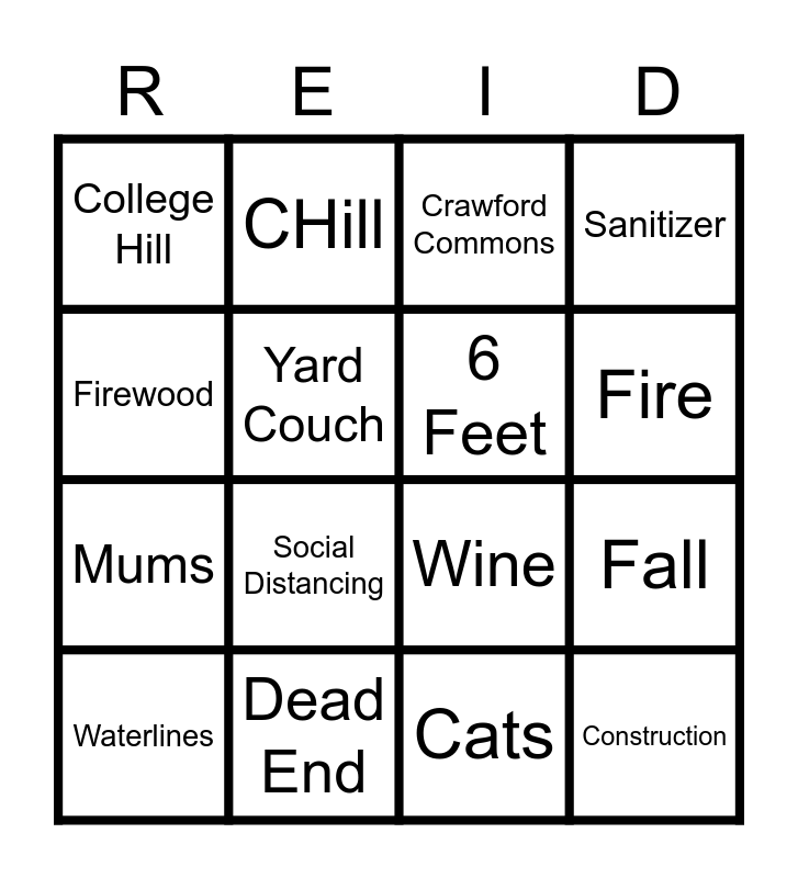 This bingo card has 36 words: Free!, Reid Ave, COVID-19, Construction, Waterlines, Dead End, Crawford Commons, Block Party, College Hill, Dogs, Cats, Fall, September, Social Distancing, 6 Feet, Sanitizer, Neighbors, Piñata, Beer, Fire, Mums, Pumpkins, Bingo, Friends, The New Town in Town, CHill, Wine, 1866, Firewood, Yard Couch, Cooler, Home, Outdoor Movie, Tiki Torches, 6:30p and Late Night.
