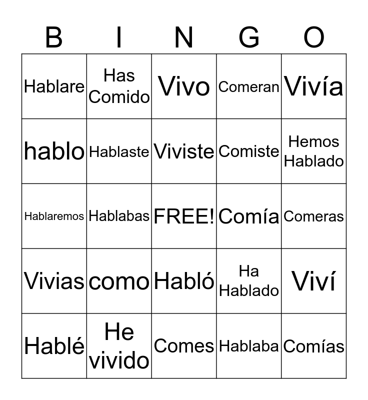 This bingo card has a free space and 24 words: como, He vivido, Viviste, Hablé, Vivía, Hablare, hablo, Has Comido, Comía, Habló, Comiste, Hablaremos, Ha Hablado, Viví, Hablaste, Hablaba, Comeras, Vivo, Hemos Hablado, Hablabas, Comías, Vivias, Comeran and Comes.