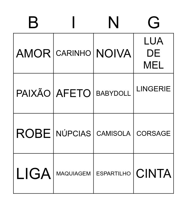 This bingo card has 25 words: CALCINHA, SUTIÃ, LINGERIE, Free!, PAIXÃO, AMOR, AFETO, CARINHO, MAQUIAGEM, BATOM, ROBE, CAMISOLA, TANGA, BODY, BABYDOLL, FIO DENTAL, ESPARTILHO, NOIVA, NÚPCIAS, CORSAGE, LIGA, MASSAGEM, CINTA, LUA DE MEL and SHORTDOLL.