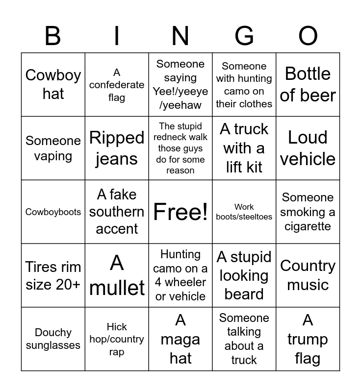 This bingo card has a free space and 24 words: A mullet, Hick hop/country rap, The stupid redneck walk those guys do for some reason, Douchy sunglasses, Bottle of beer, Cowboy hat, Someone vaping, A confederate flag, Work boots/steeltoes, Hunting camo on a 4 wheeler or vehicle, A truck with a lift kit, Cowboyboots, A stupid looking beard, Country music, Ripped jeans, Someone talking about a truck, Someone smoking a cigarette, Someone saying Yee!/yeeye /yeehaw, Loud vehicle, A fake southern accent, A trump flag, Tires rim size 20+, Someone with hunting camo on their clothes and A maga hat.