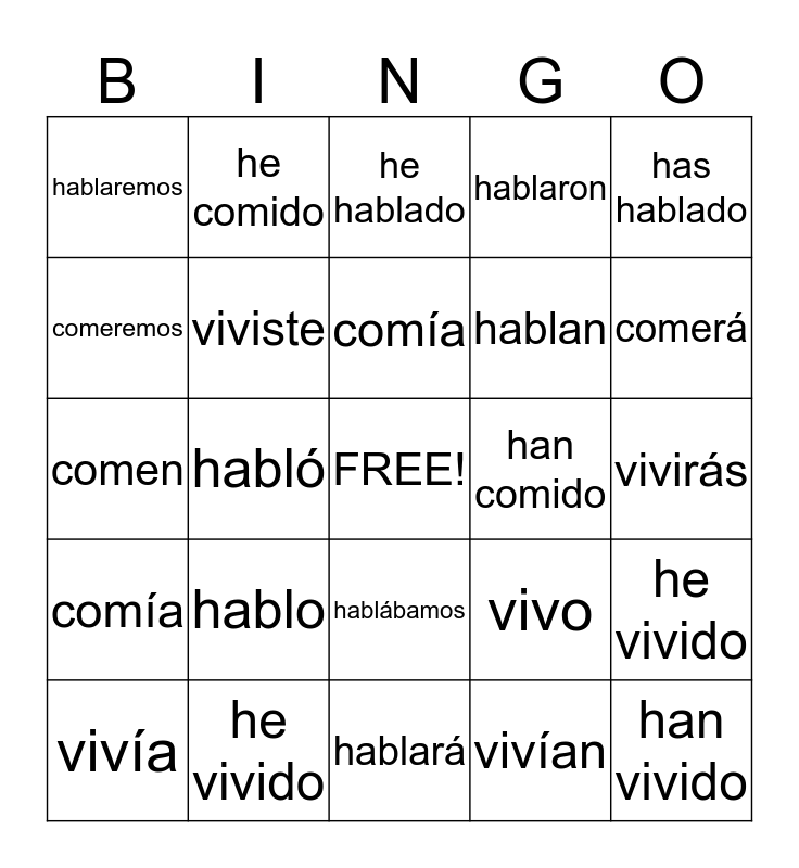 This bingo card has a free space and 24 words: hablo, he vivido, comía, vivía, has hablado, hablaremos, comeremos, he comido, han comido, hablábamos, hablan, comen, vivo, he vivido, viviste, vivían, vivirás, he hablado, comerá, habló, han vivido, comía, hablaron and hablará.