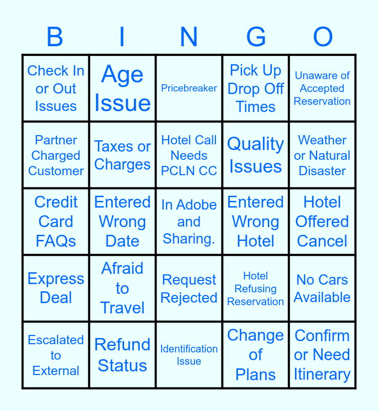 This bingo card has a free space and 24 words: Afraid to Travel, Refund Status, Hotel Call Needs PCLN CC, Escalated to External, Unaware of Accepted Reservation, Check In or Out Issues, Partner Charged Customer, Age Issue, Entered Wrong Hotel, Request Rejected, Quality Issues, Credit Card FAQs, Hotel Refusing Reservation, No Cars Available, Taxes or Charges, Change of Plans, Hotel Offered Cancel, Pricebreaker, Weather or Natural Disaster, Entered Wrong Date, Confirm or Need Itinerary, Express Deal, Pick Up Drop Off Times and Identification Issue.