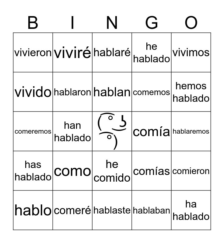 This bingo card has a free space and 24 words: como, comeré, hablan, hablo, vivimos, vivieron, vivido, viviré, comía, he comido, comemos, comeremos, comías, comieron, hablaron, hablaban, hablaremos, hablaré, hemos hablado, han hablado, ha hablado, has hablado, he hablado and hablaste.